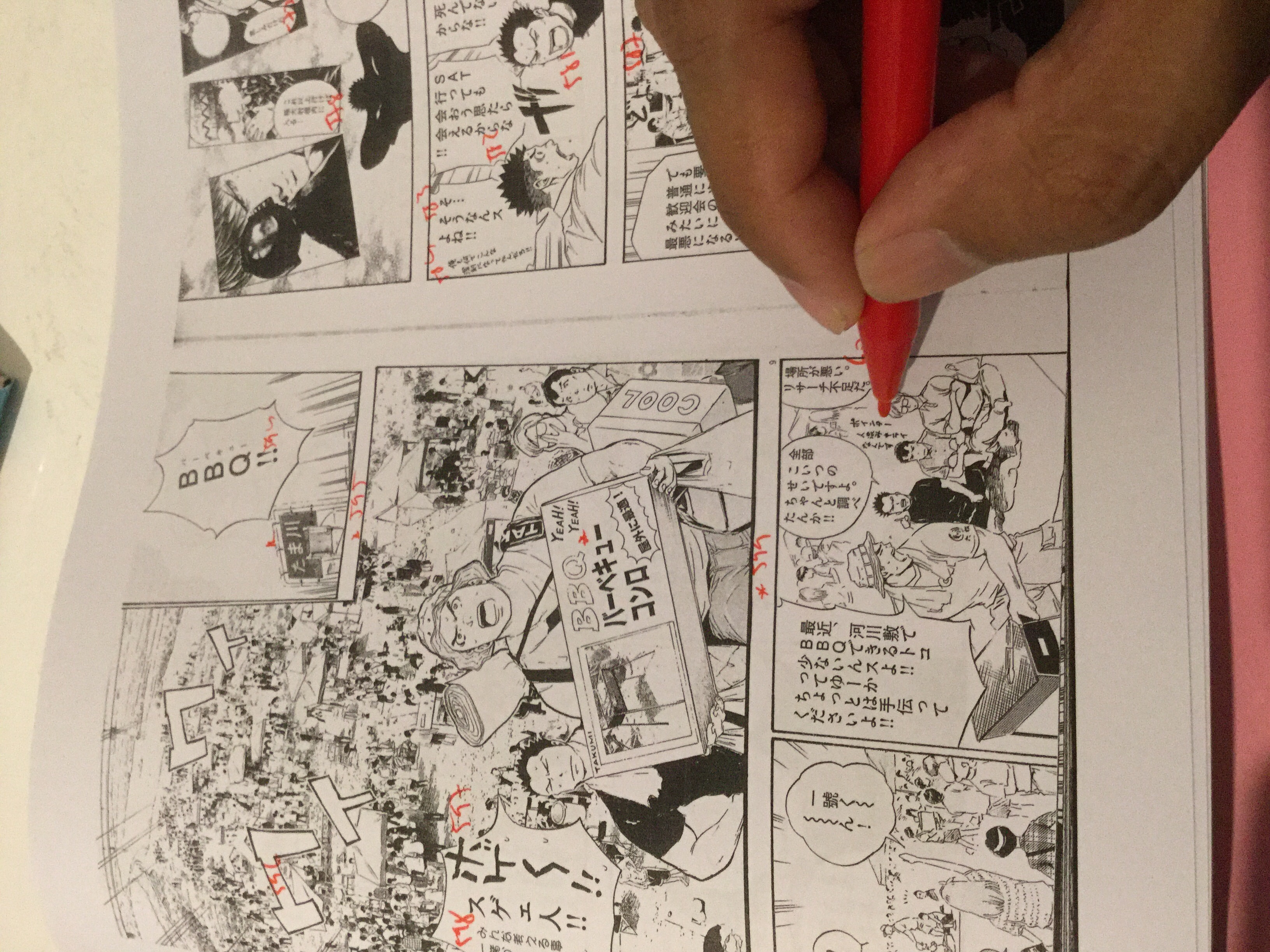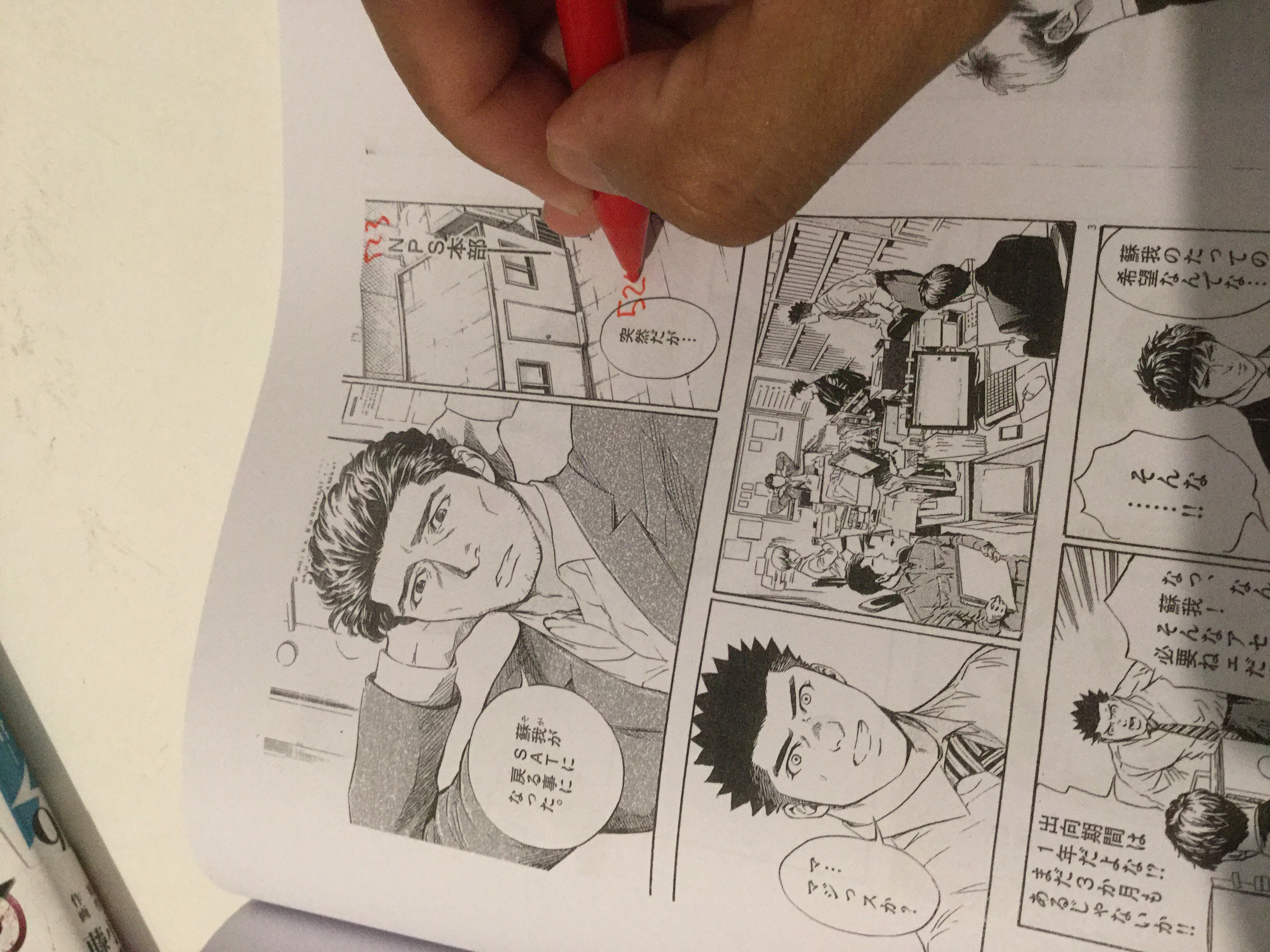 Proses selanjutnya adalah memberi nomor pada balon-balon dialog, efek suara, narasi, dam teks-teks lainnya yang harus diterjemahkan. Nomor dituliskan secara berurutan dari 1 dengan menggunakan spidol berwarna merah. Pada saat memberikan nomor, kadang ada balon dialog atau teks yang terlewat untuk dinomori. Biasanya saya menyiasatinya dengan memberi tambahan “-1” dari nomor sebelumnya. Contohnya, jika dialog yang terlewat berada di antara no. 103 dan no. 104, maka saya akan beri nomor 103-1 untuk dialog yang terlewat tersebut.