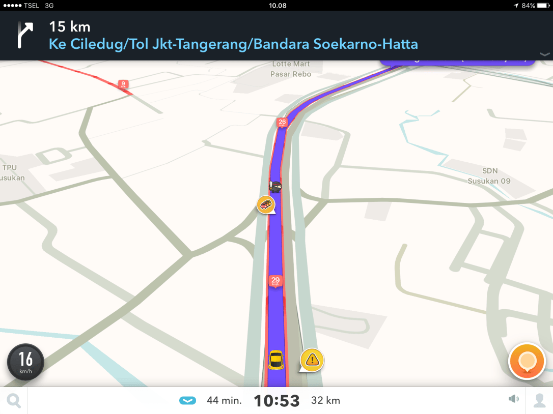 Untuk navigasi sendiri saya sering menggunakan aplikasi Waze. Aplikasi milik Google ini juga mampu memberikan informasi lalu lintas karena sifatnya yang crowdsource. Waktu tempuh yang diperkirakan pun cukup akurat, tetapi dengan catatan lalu lintasnya benar-benar bergerak walaupun kurang dari 10 km/jam. Apabila kondisinya macet total alias sama sekali tidak bergerak, barulah perkiraan waktu tempuhnya menjadi tidak bisa diandalkan. Untungnya aplikasi ini dapat menyarankan beberapa rute, sehingga selalu ada pilihan dalam mencapai tempat tujuan.